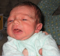 Here's the shortened story of the labor and delivery for now. I'll catch you up on details and more pics later after I've rested. Yesterday, 4 am, water broke. Nothing happened much until 9:30, when irregular light contractions started. By 11 am, very active labor had begun and by 11:30 we had left for the 1/2 hour ride to the hospital. By that time, I was in transition, which is the last stage before you push!! We rode in our 4 wheel drive very quickly (to say the least) on the snowy roads, got to the hospital, got to the delivery room about 11:49 AM, and he was born 22 minutes later at 12:11 PM. We just about didn't make it. 3 pushes and he was out. We are still in shock that he came so fast. But we are totally in love! He's nursing well and is calm and preciously cuddly. Thanks for all the prayers for a safe drive and delivery!